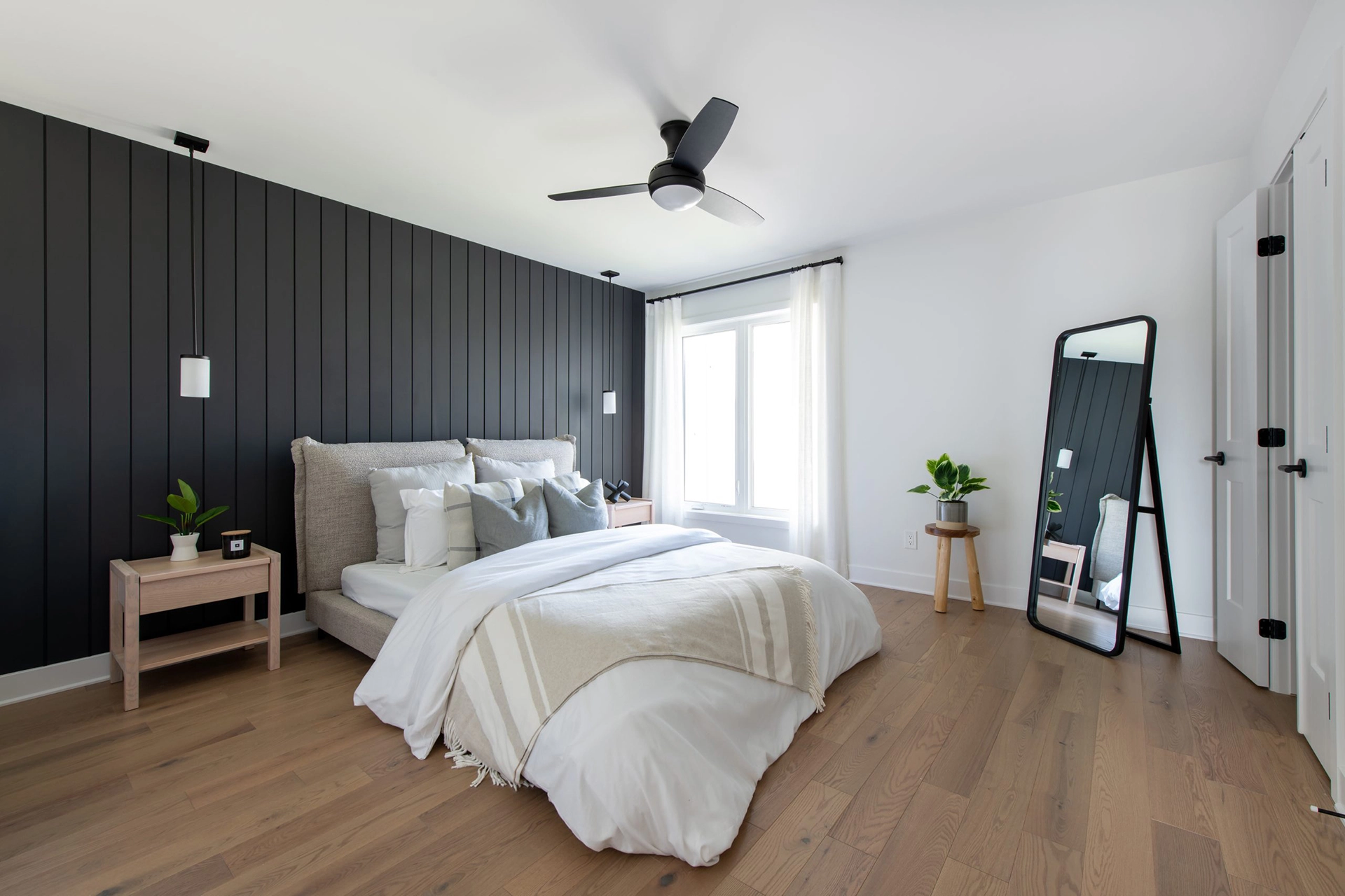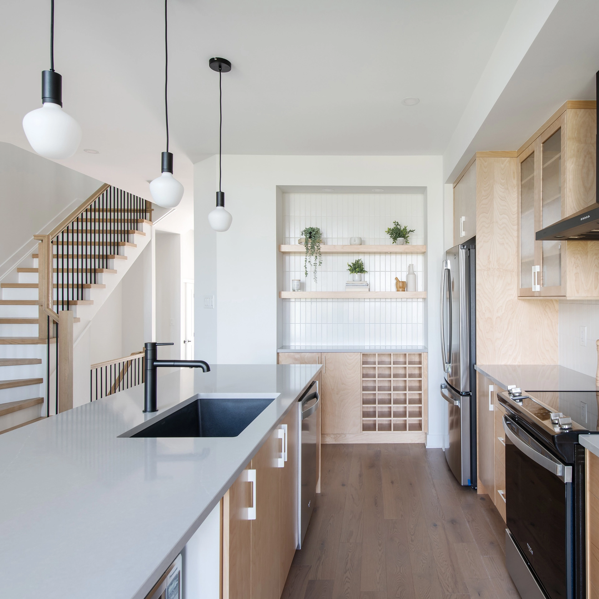 - Hardwood staircases with black metal spindles, painted white risers and stringers